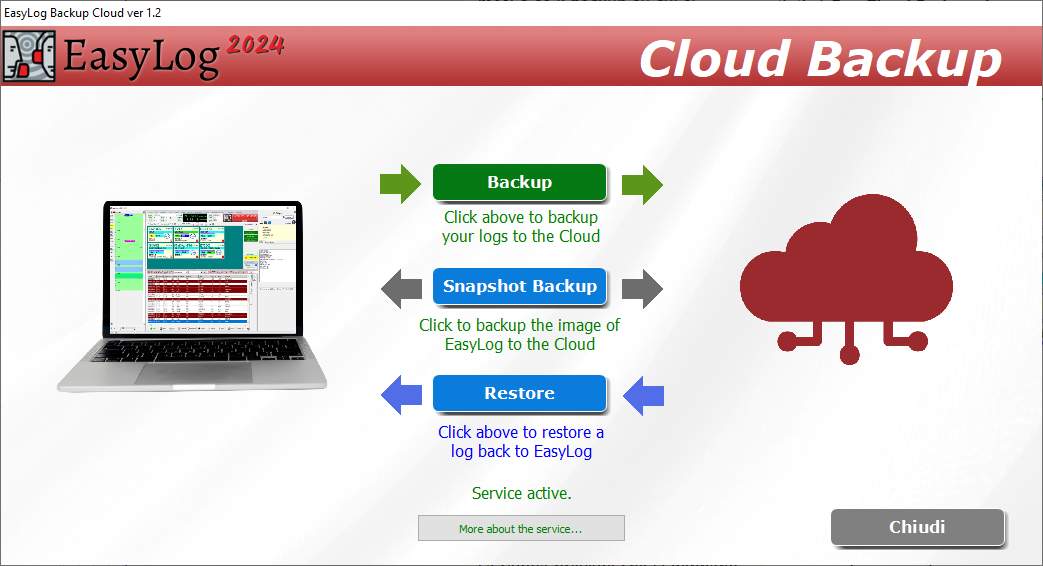 | | |  | ✅ Plenty of space for your Backups, EasyLog Cloud Backup can hold for example 2000 backups of a log with 10000 QSOs, or 400 backups of a log with 50000 QSOs. | ✅ You can back up all your logs and decide how many recent copies you want to keep and delete the copies you no longer need thanks to the convenient control panel. | ✅ Generate an image of your EasyLog installation, that includes everything, essential files, manager archives, CHECK, the current EasyLog version, and all your configurations. | ✅ Backing up, restoring, syncing between computers, or reinstalling on a new device becomes effortless. | ✅ Request the free 7-day trial with no obligation | | | | |
